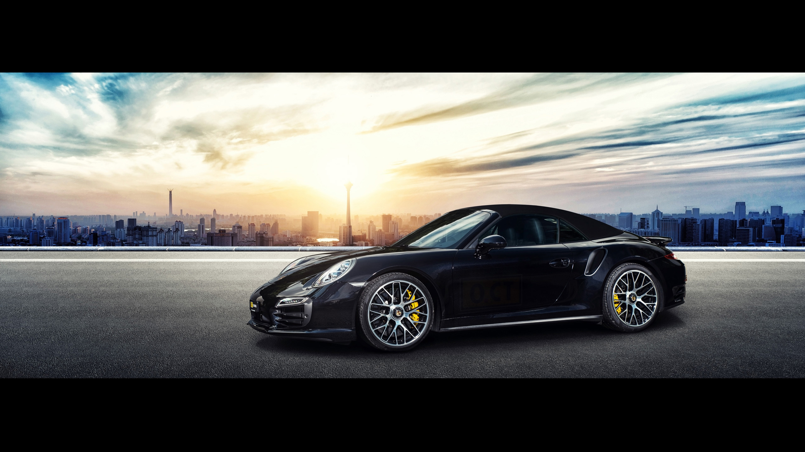Description: A black porsche parked in front of a city skyline at sunset with the sun setting behind it and clouds in the sky.