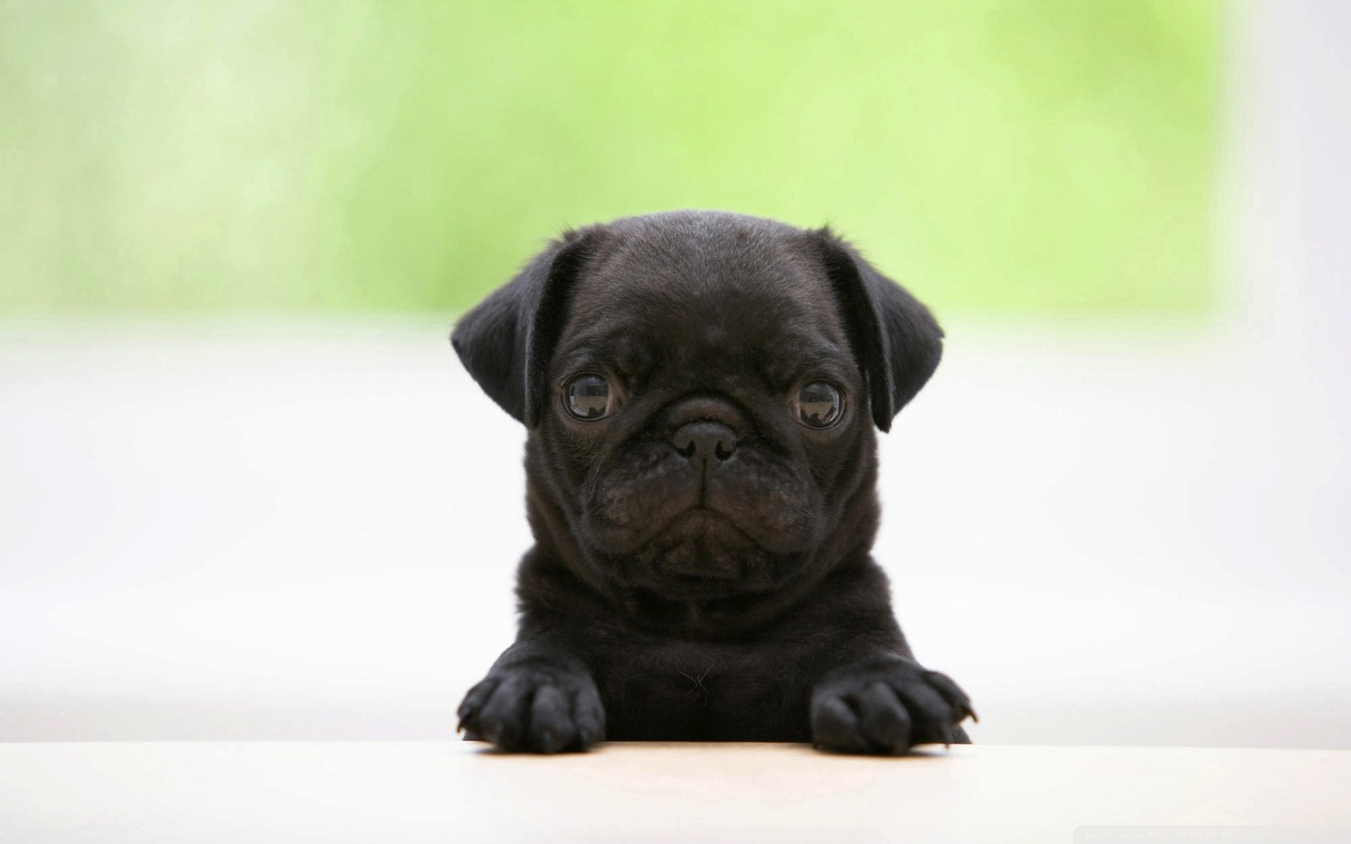 Description: A black puppy is sitting on a table looking at the camera with a sad look on his face and eyes.
