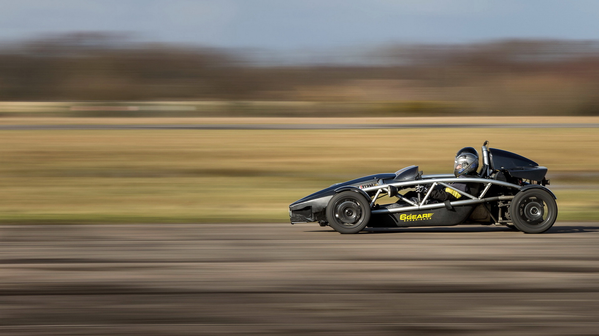 Description: A black race car driving down a road next to a field of grass and trees in the background.