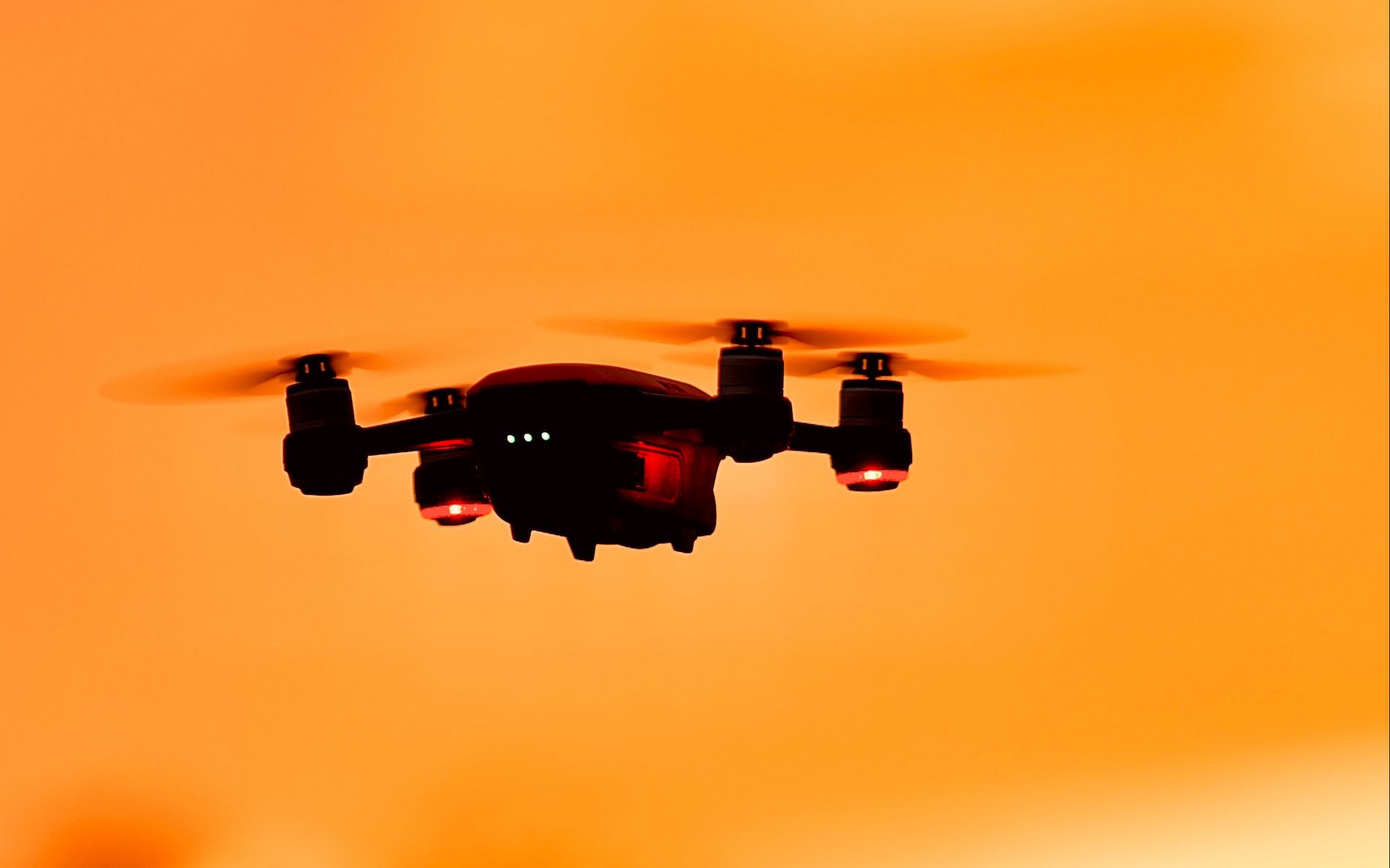 Description: A small black and red flying through the air with a yellow background behind it and a red light on the bottom of the picture.