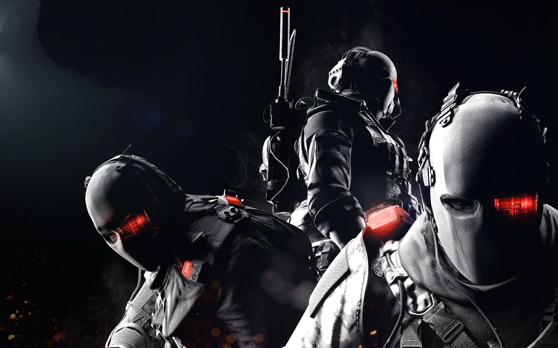 Description: A group of people in black and red outfits with guns in their hands and a flashlight in their hand.