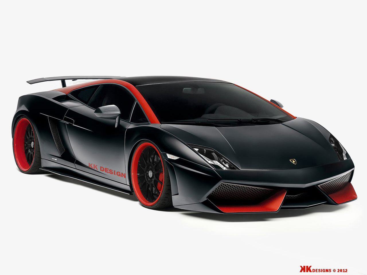 Description: A black and red lamb lamb car on a white background with a red stripe on the front of the car.