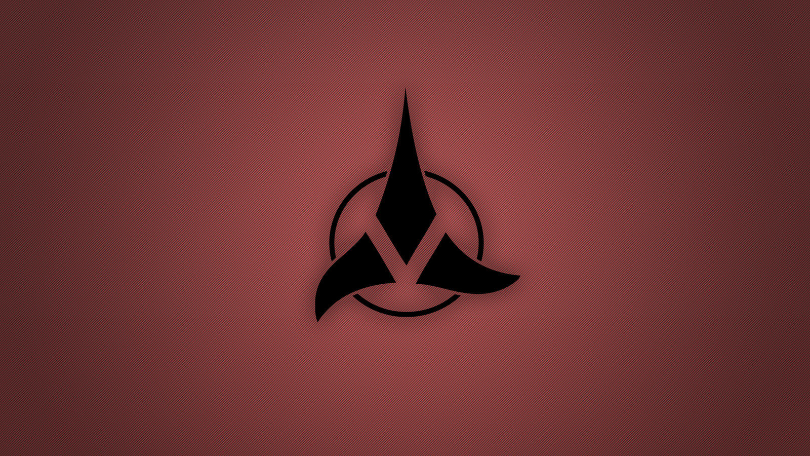 Description: A black and red logo on a red background with a black star trek symbol on it's side.