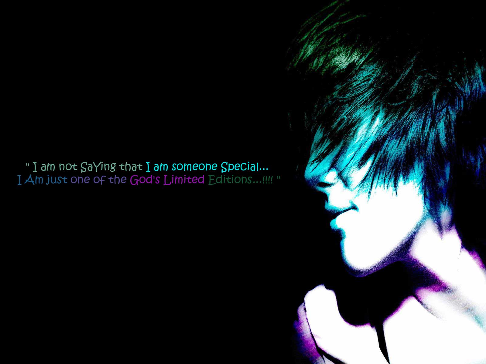 Description: A person with a black shirt and a green and blue background with a quote on it that says i am not saying that i am someone special.