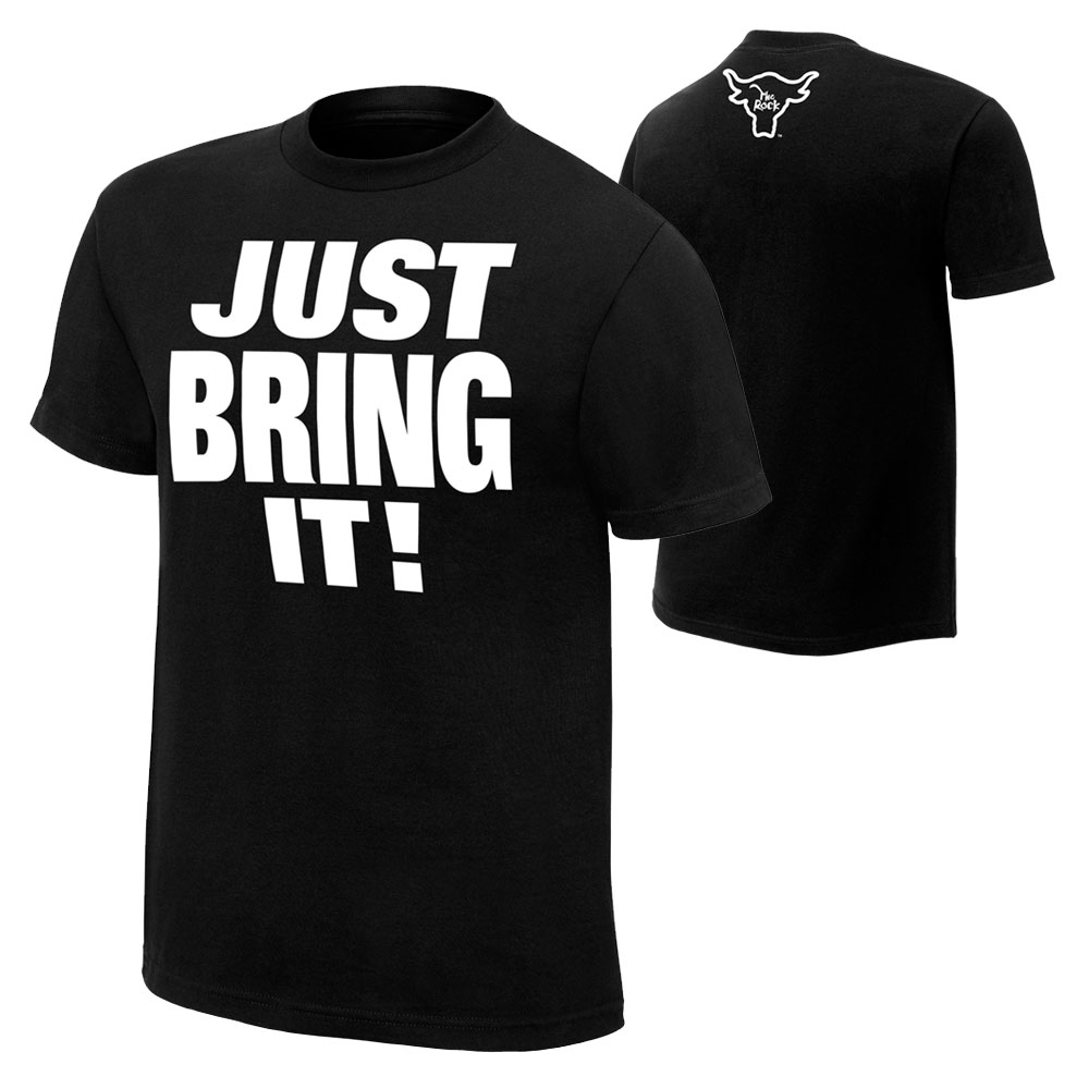Description: A black shirt with white lettering that says just bring it on it and a white fox head on the front.