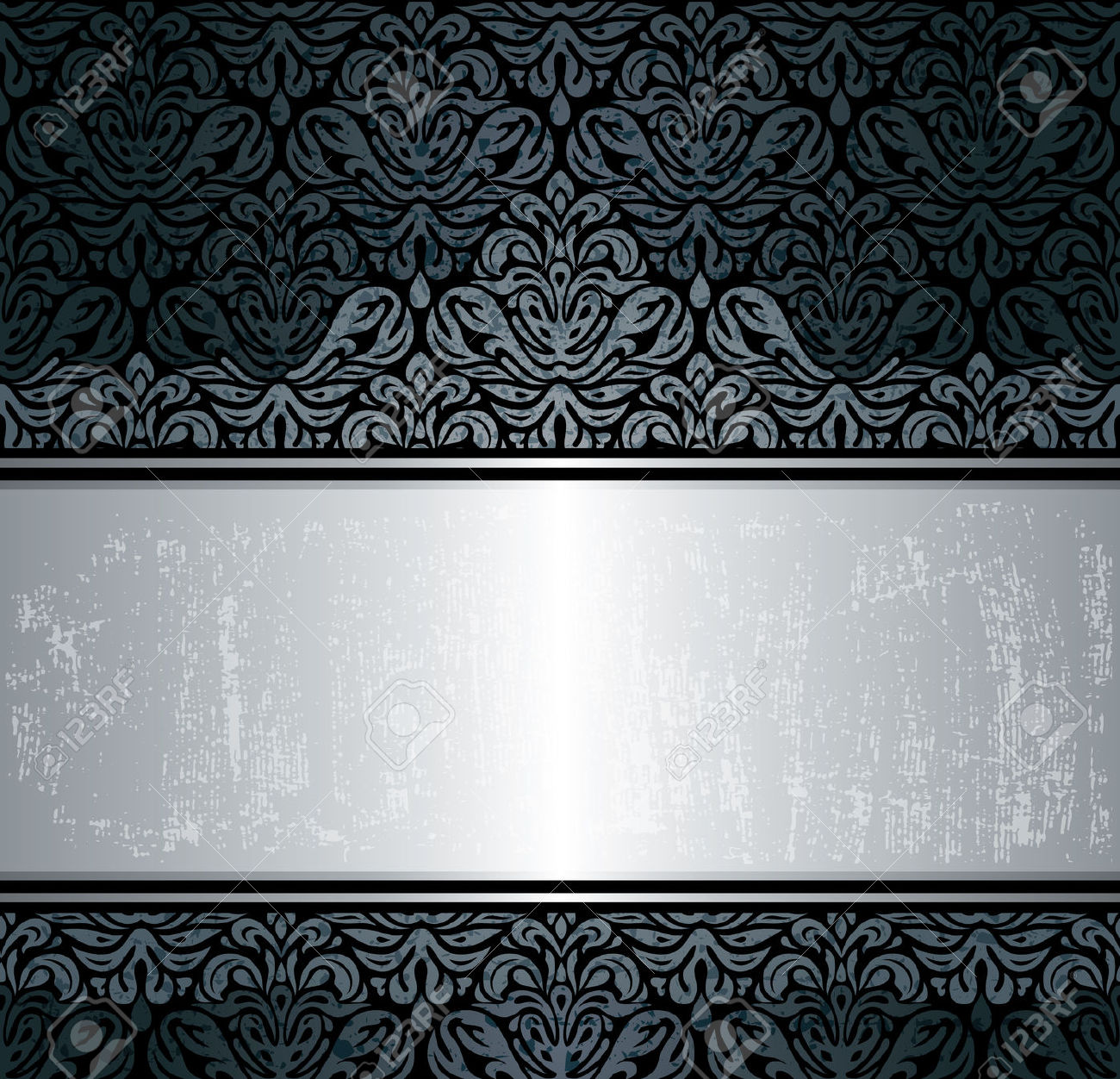 Description: A black and silver background with a silver ribbon on the bottom of it.