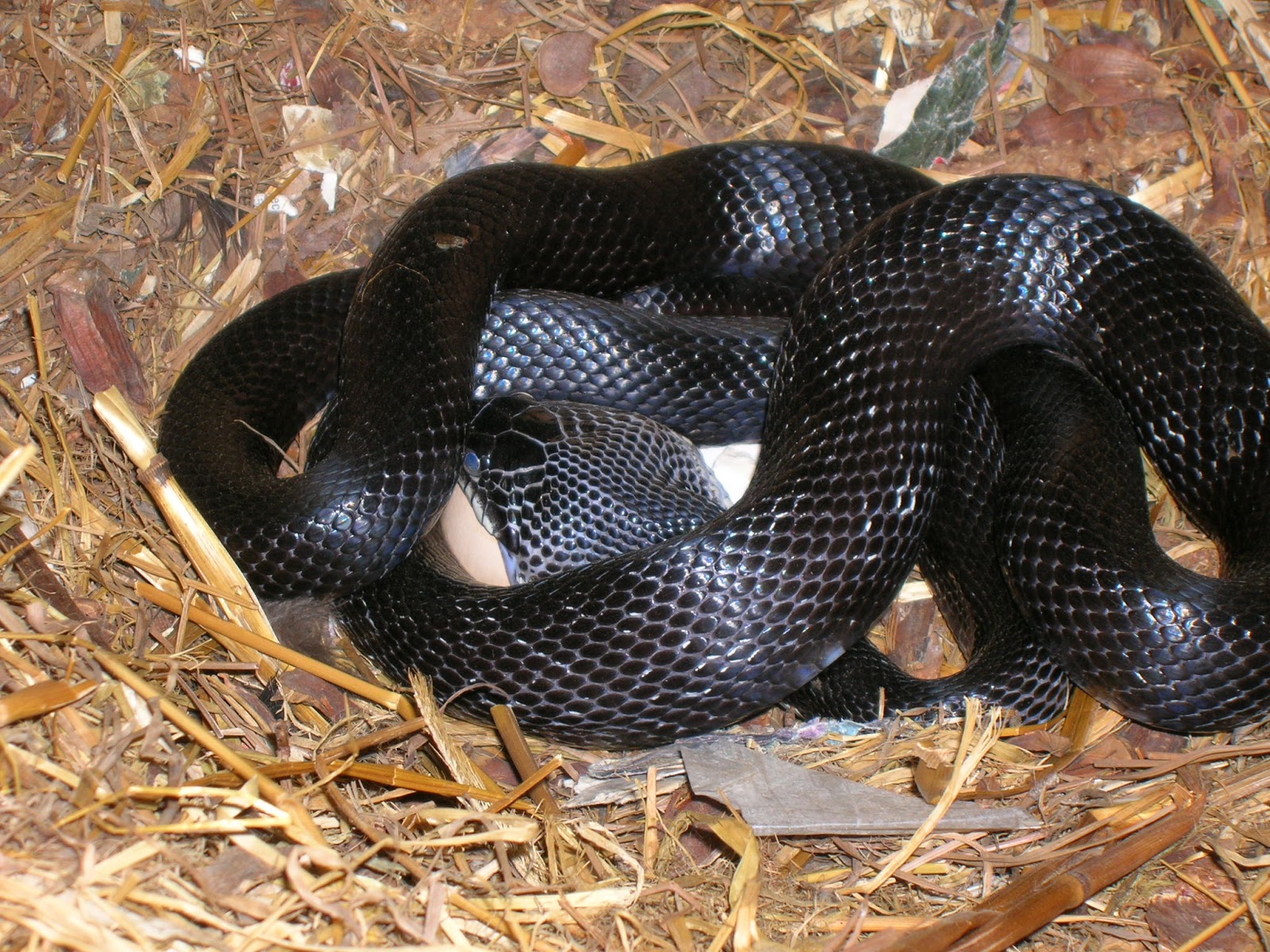 Description: A black snake curled up on the ground in a pile of straw and straw mulchs with a white spot on the top of the snake.