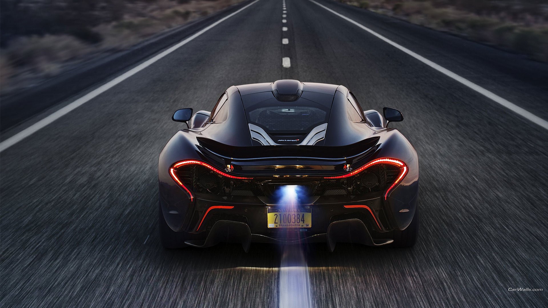 Description: A black sports car driving down a road with a bright light on it's side and a rear view mirror on the front of the car.