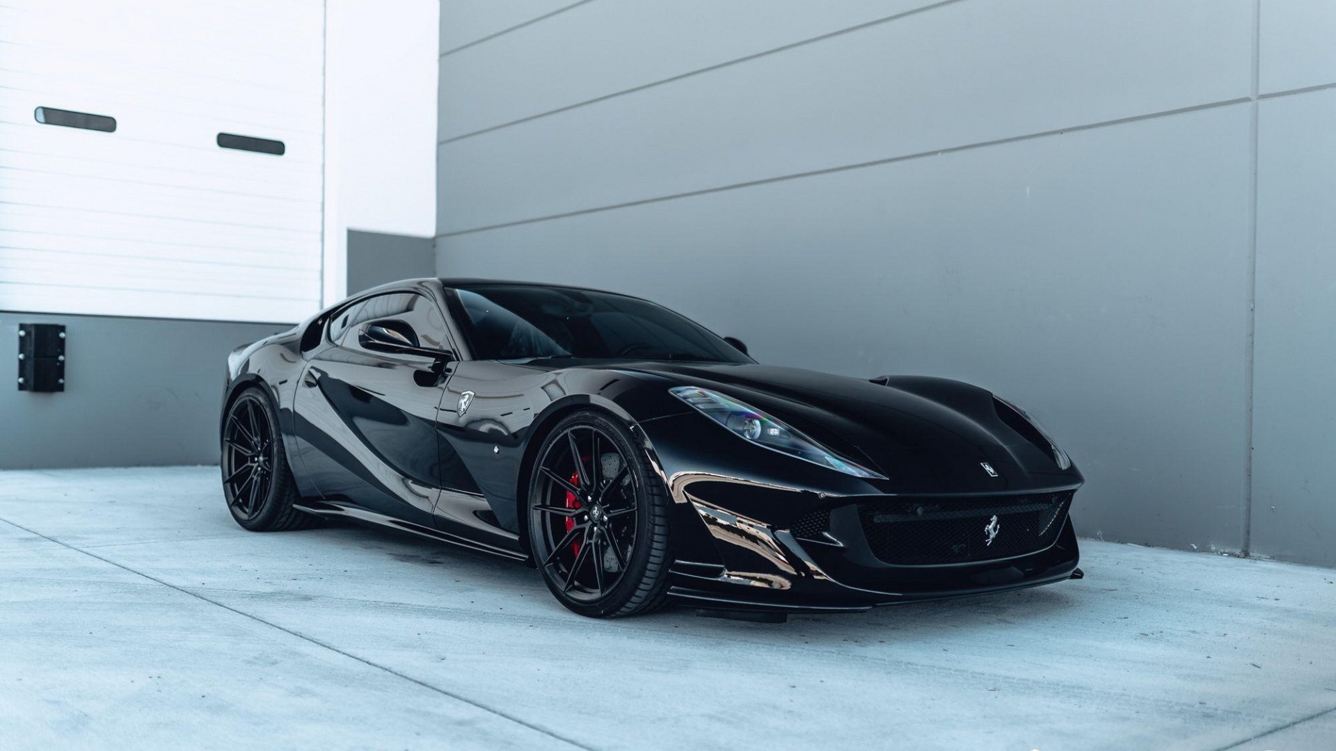 Description: A black sports car parked in front of a building with a garage door open and a white garage door.