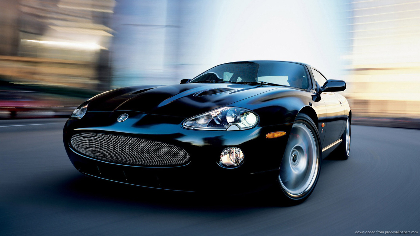 Description: A black sports car driving down a city street with buildings in the background and a blurry image of the front of the car.