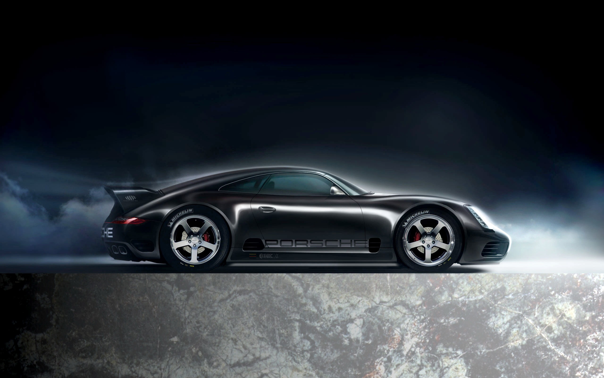 Description: A black sports car is shown in a dark background with clouds and smoke around it.