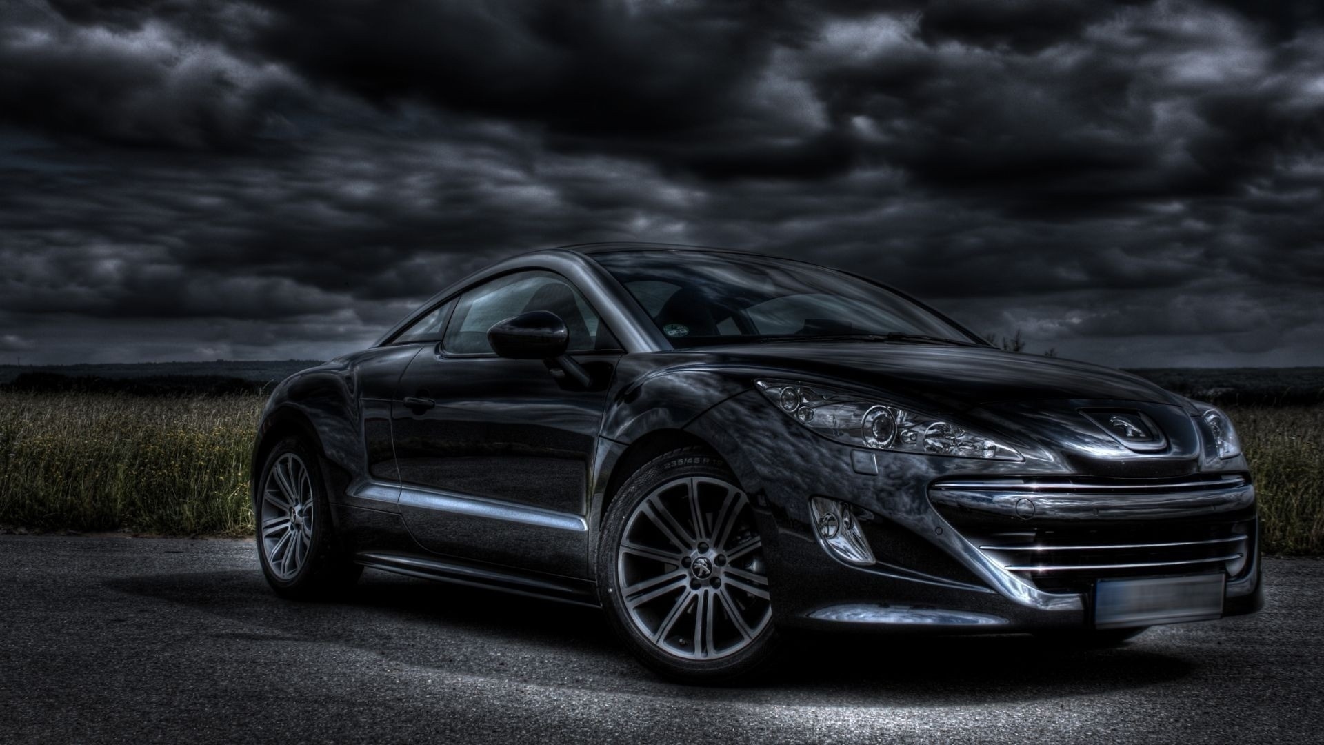 Description: A black sports car parked in a parking lot under a cloudy sky with dark clouds above it and grass below.