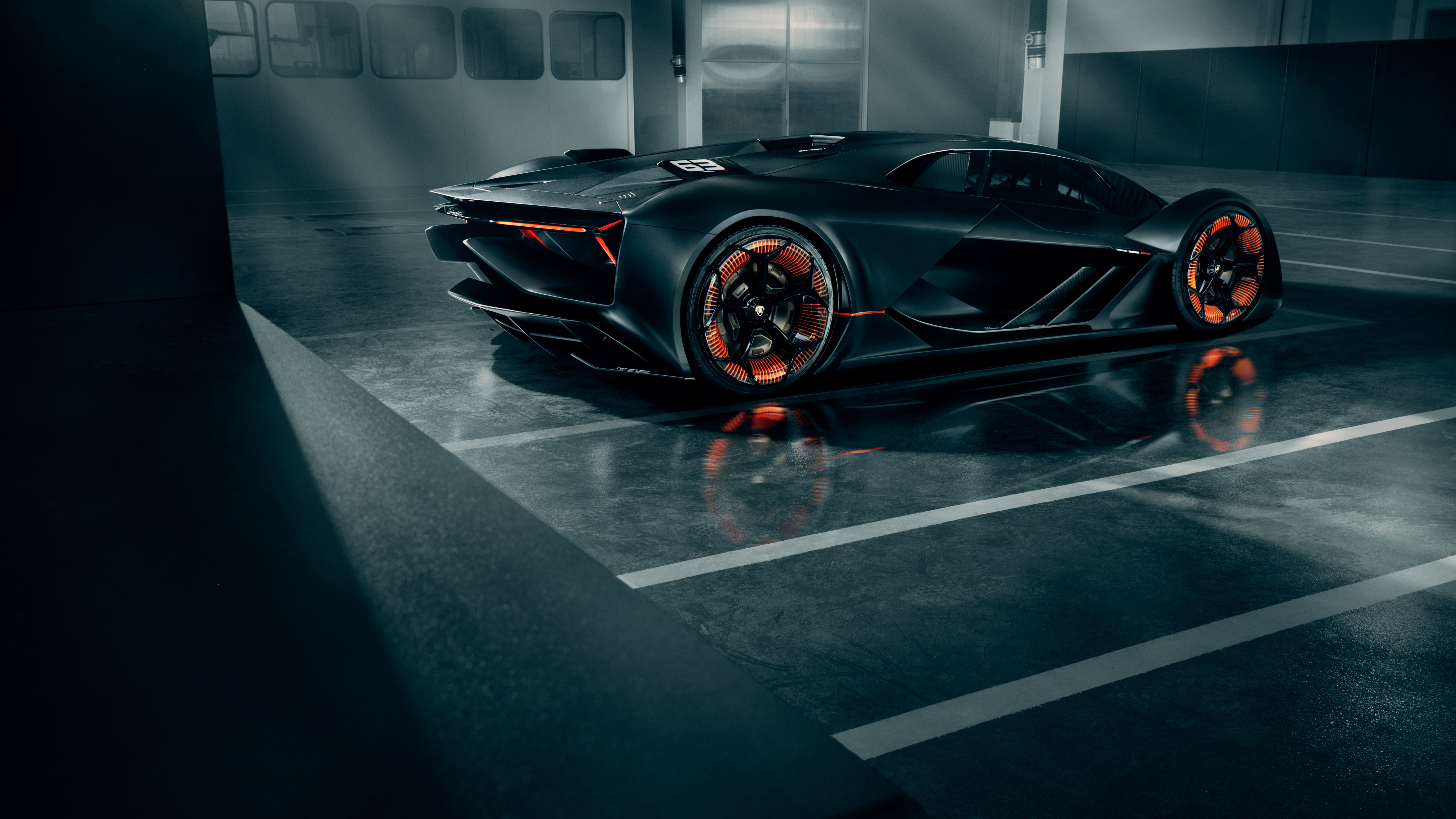 Description: A black sports car is parked in a dark room with a light shining on it's side and a black floor.