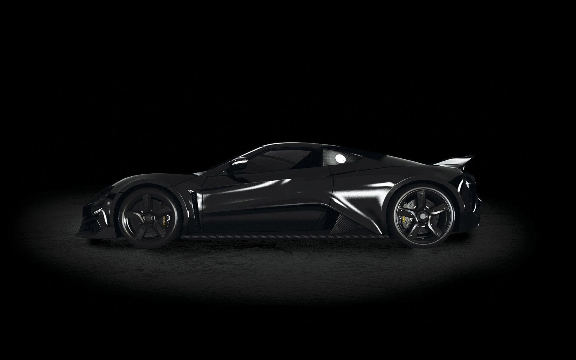 Description: A black sports car in a dark room with a black background and a black background with a black background.