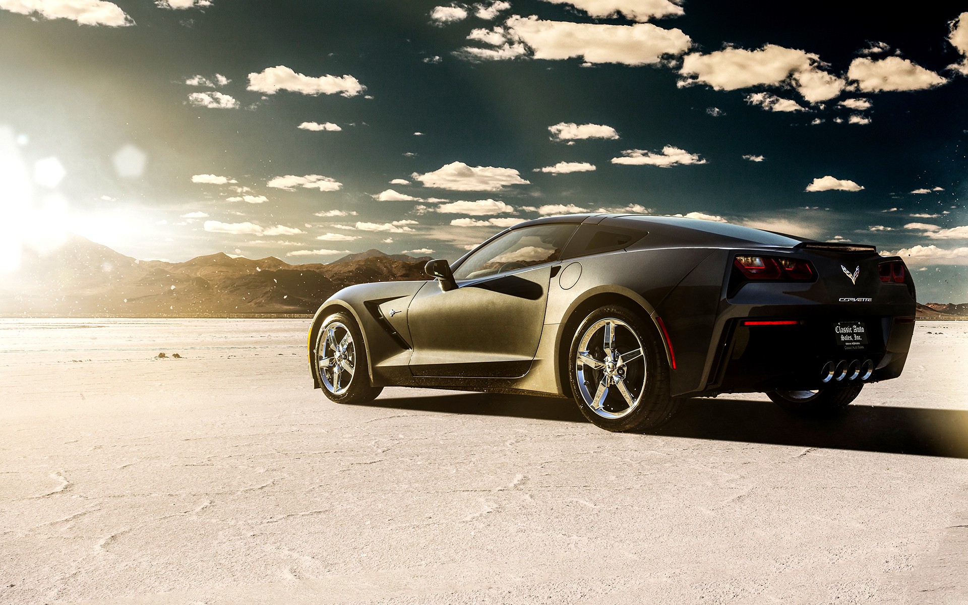 Description: A black sports car parked in a desert area with a sky background and clouds in the sky above it.