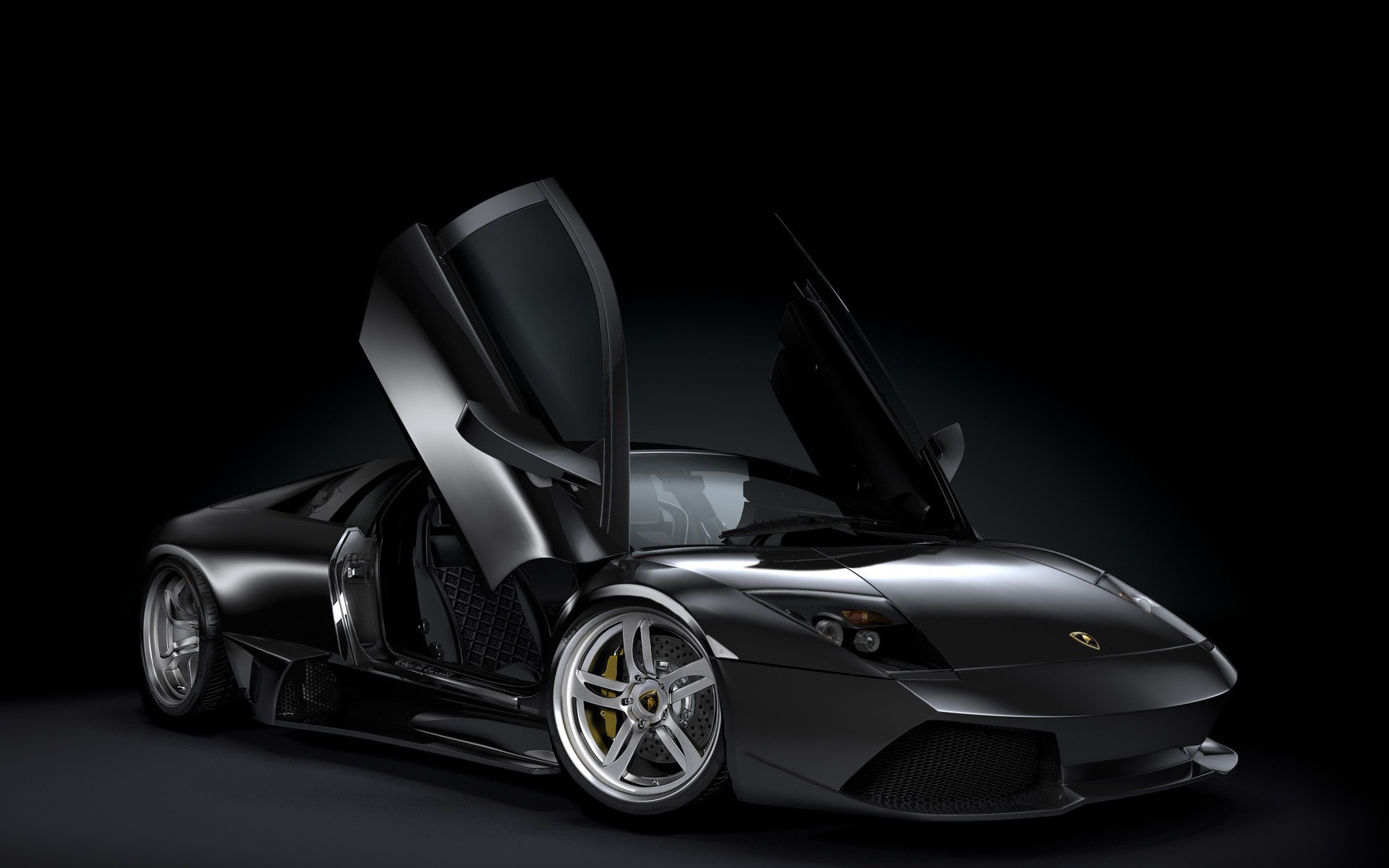 Description: A black sports car with its doors open in a dark room with a black background and a black floor.
