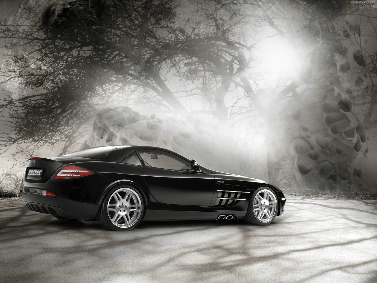 Description: A black sports car parked in a driveway next to a tree and a rock wall with a light shining on it.
