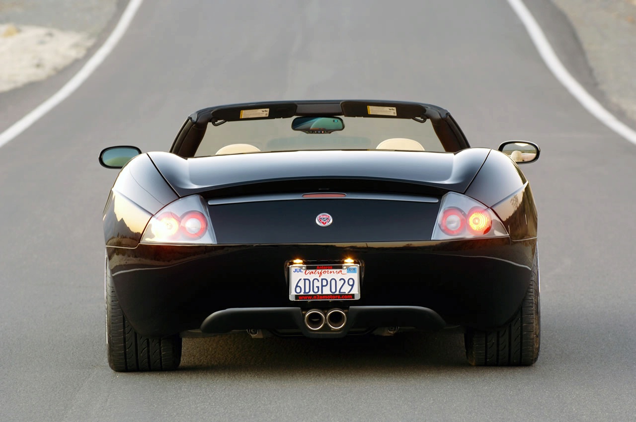 Description: A black sports car driving down a road with a license plate on it's back end and a license plate on the front of the car.