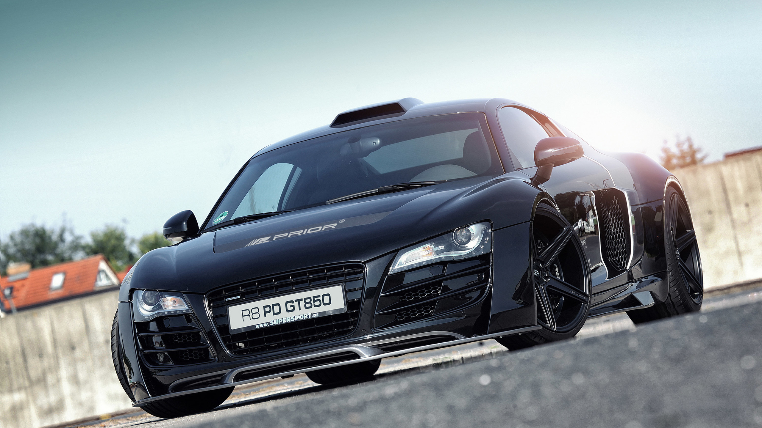 Description: A black sports car driving down a street next to a fence and a fenced in area with a fence.