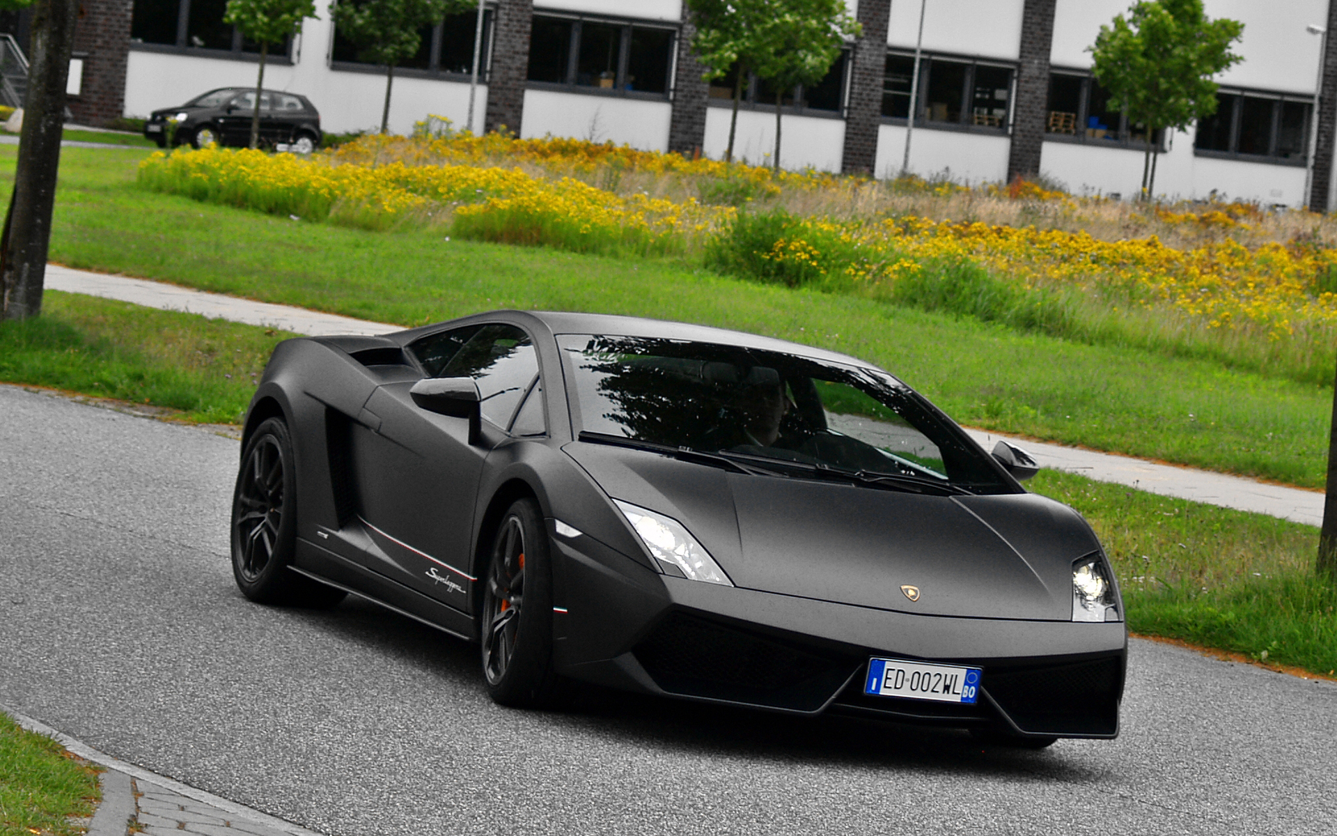 Description: A black sports car driving down a street next to a lush green field and yellow flowers on a sunny day.