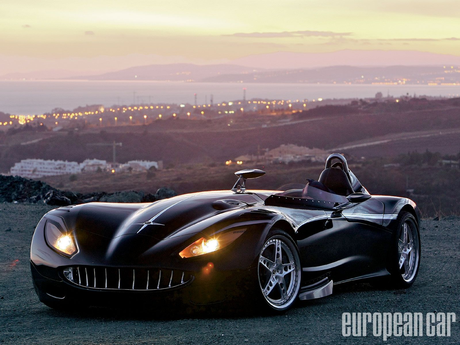 Description: A black sports car parked on a hill with a city in the background at sunset or dawn with a person in the driver seat.