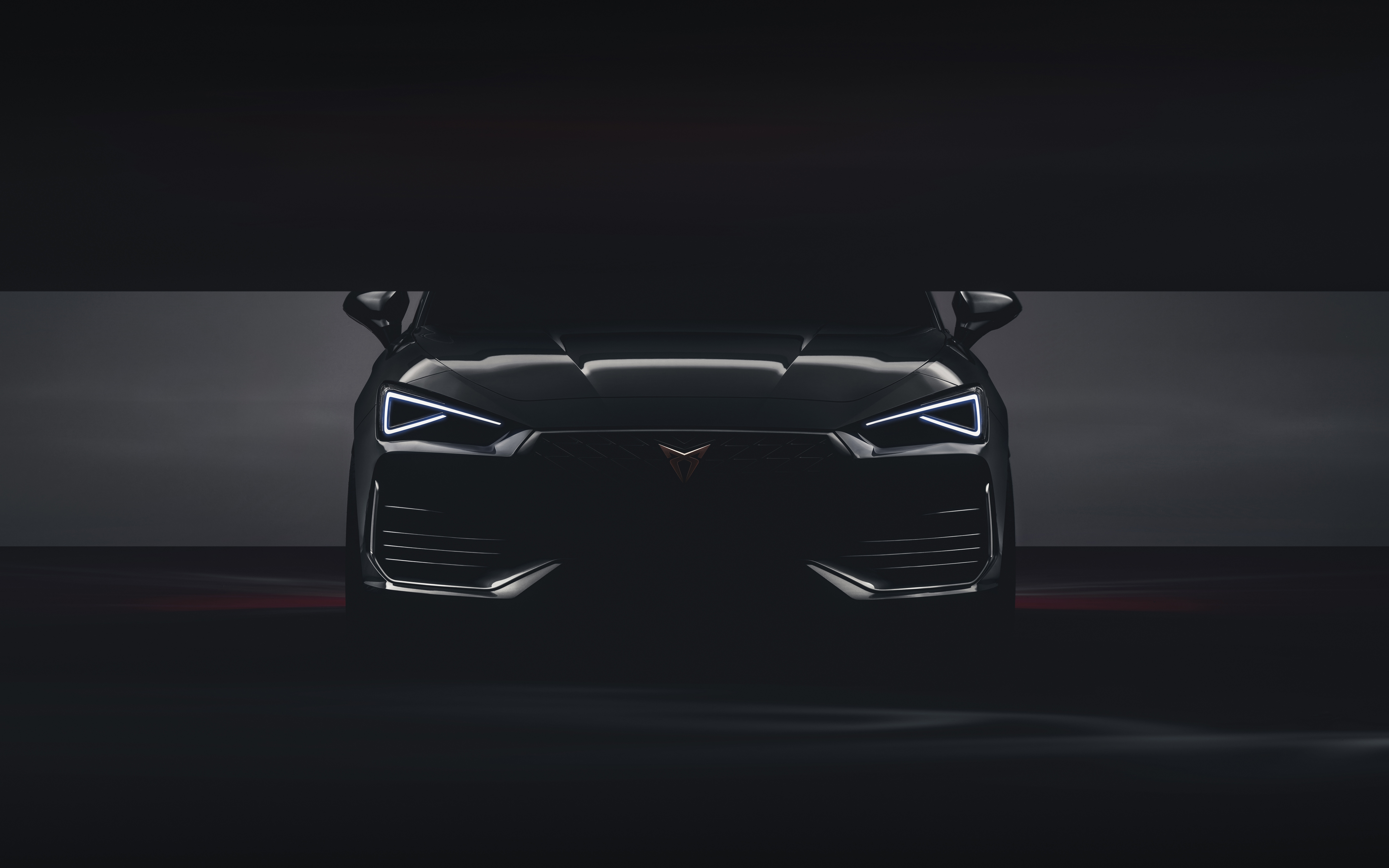 Description: A black sports car with its hood up in the dark room with a spotlight on the side of it.