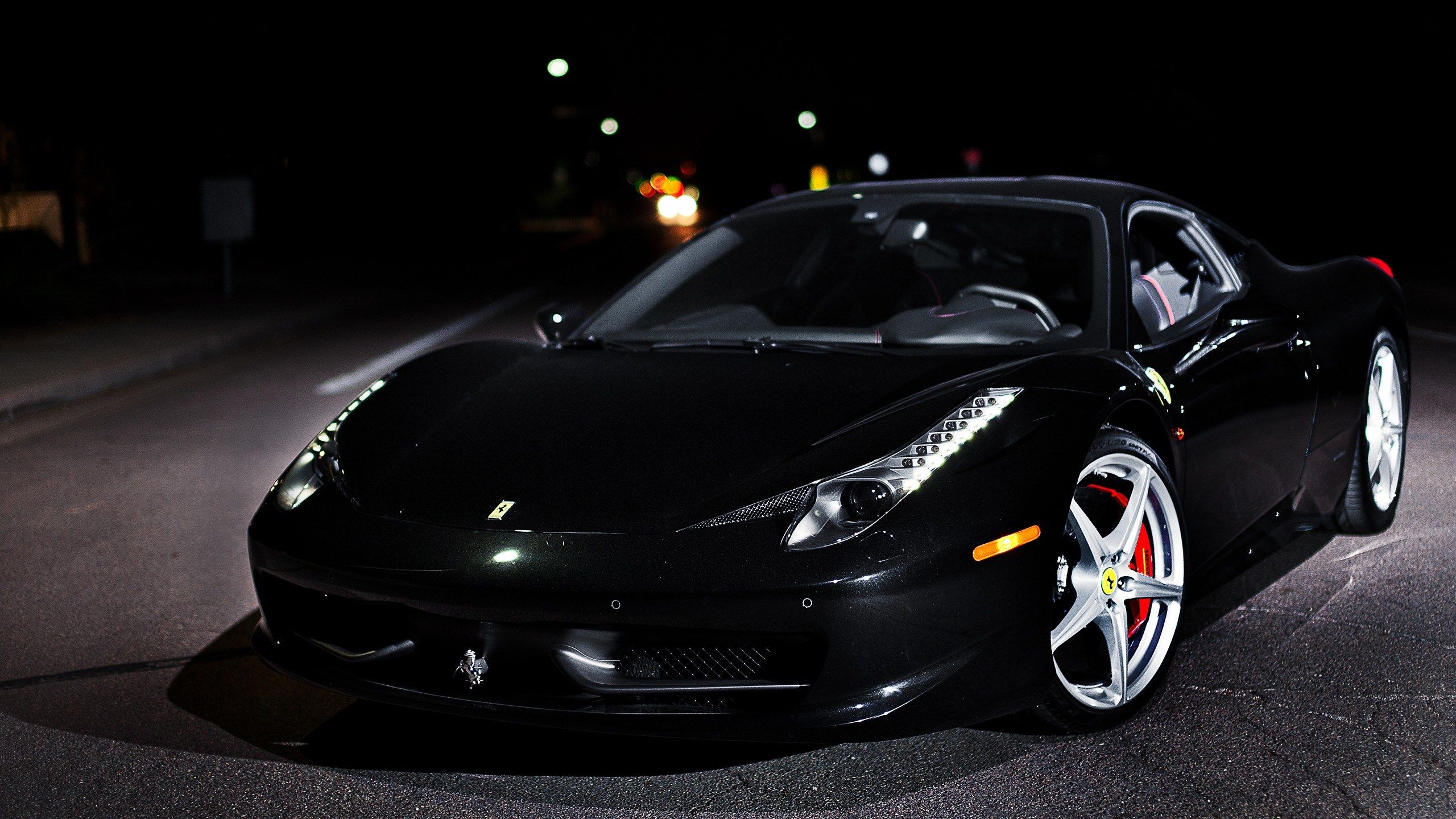 Description: A black sports car parked on the side of the road at night time with its hood up and lights on.