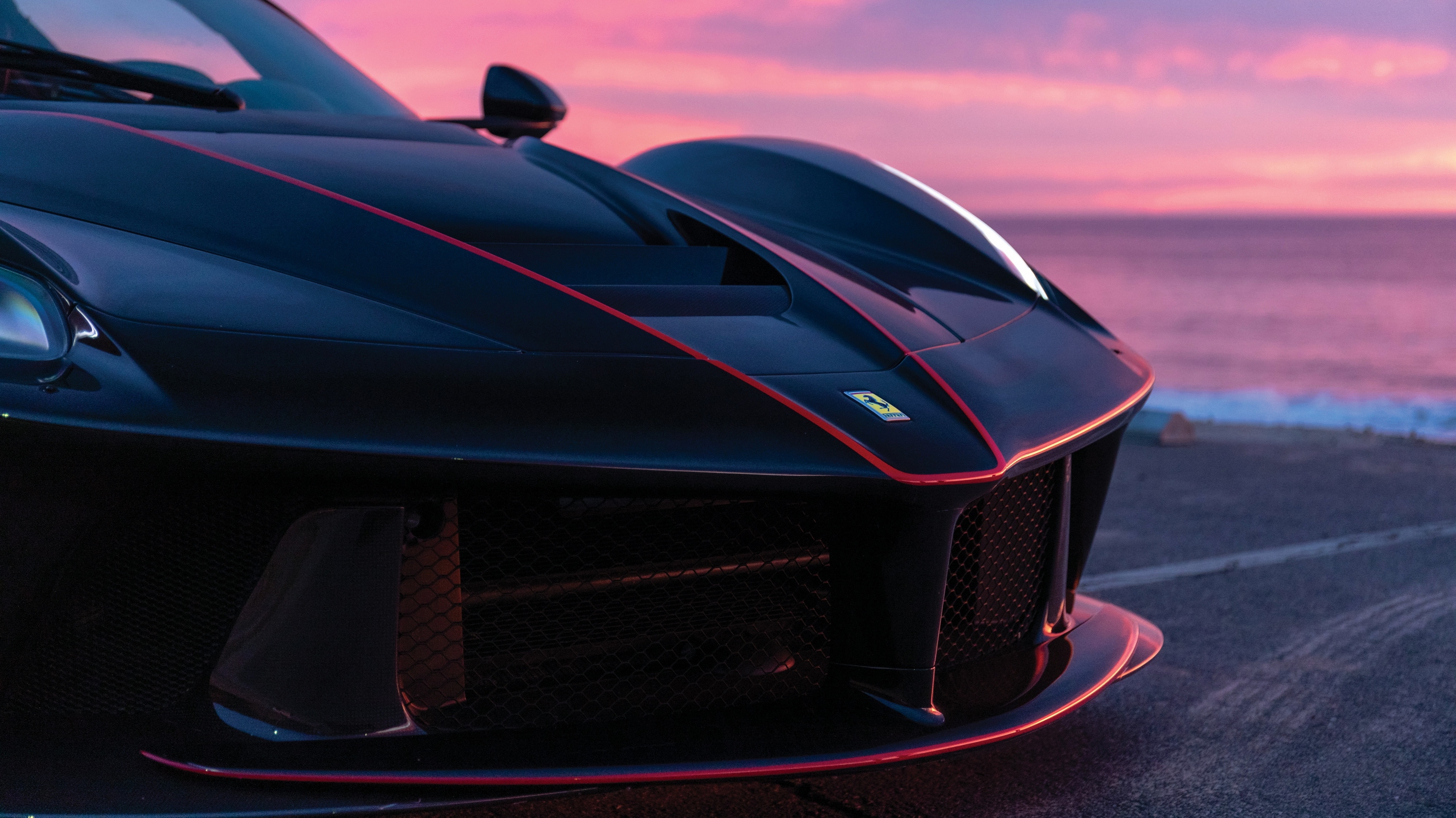 Description: A black sports car parked on the side of the road near the ocean at sunset or dawn with a pink sky.