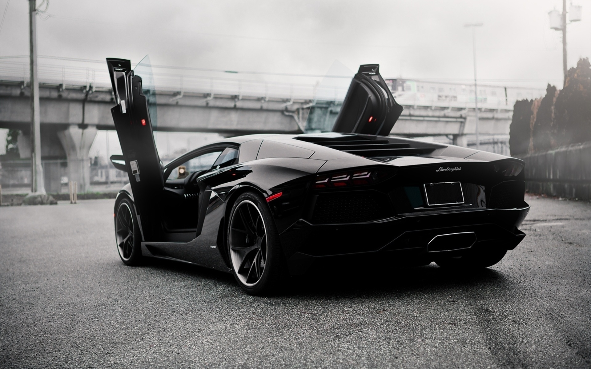 Description: A black sports car parked on the side of the road with its doors open and the door open showing.