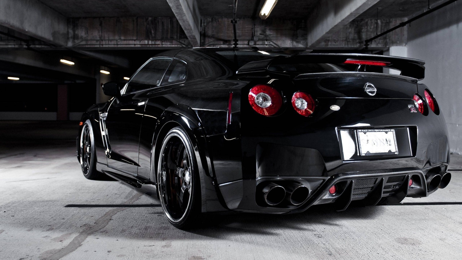 Description: A black sports car parked in a parking garage with its lights on and the rear end of the car.