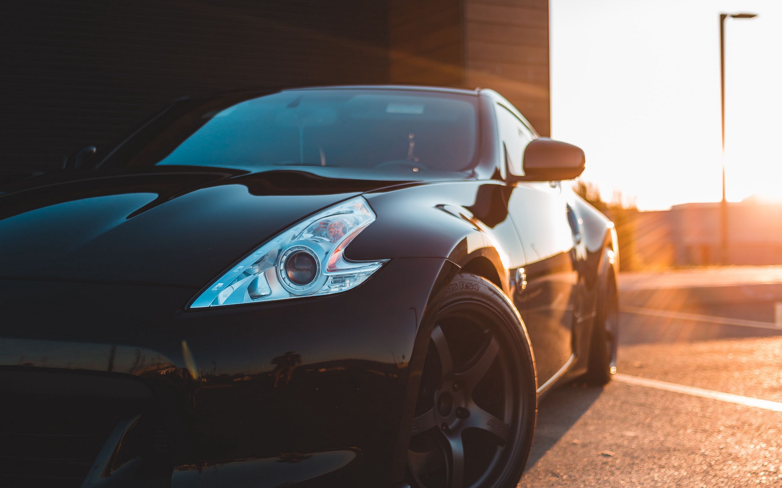 Description: A black sports car parked in a parking lot at sunset or sunrise time with the sun shining on the car.