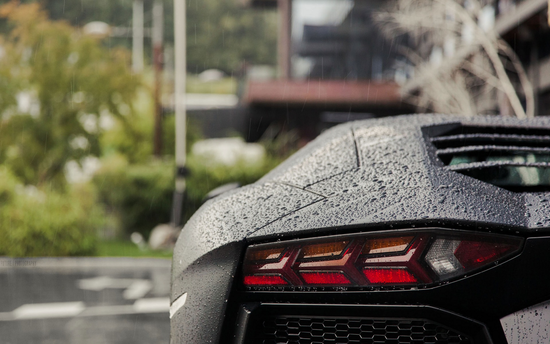 Description: A black sports car parked on the side of the road in the rain with a building in the background.