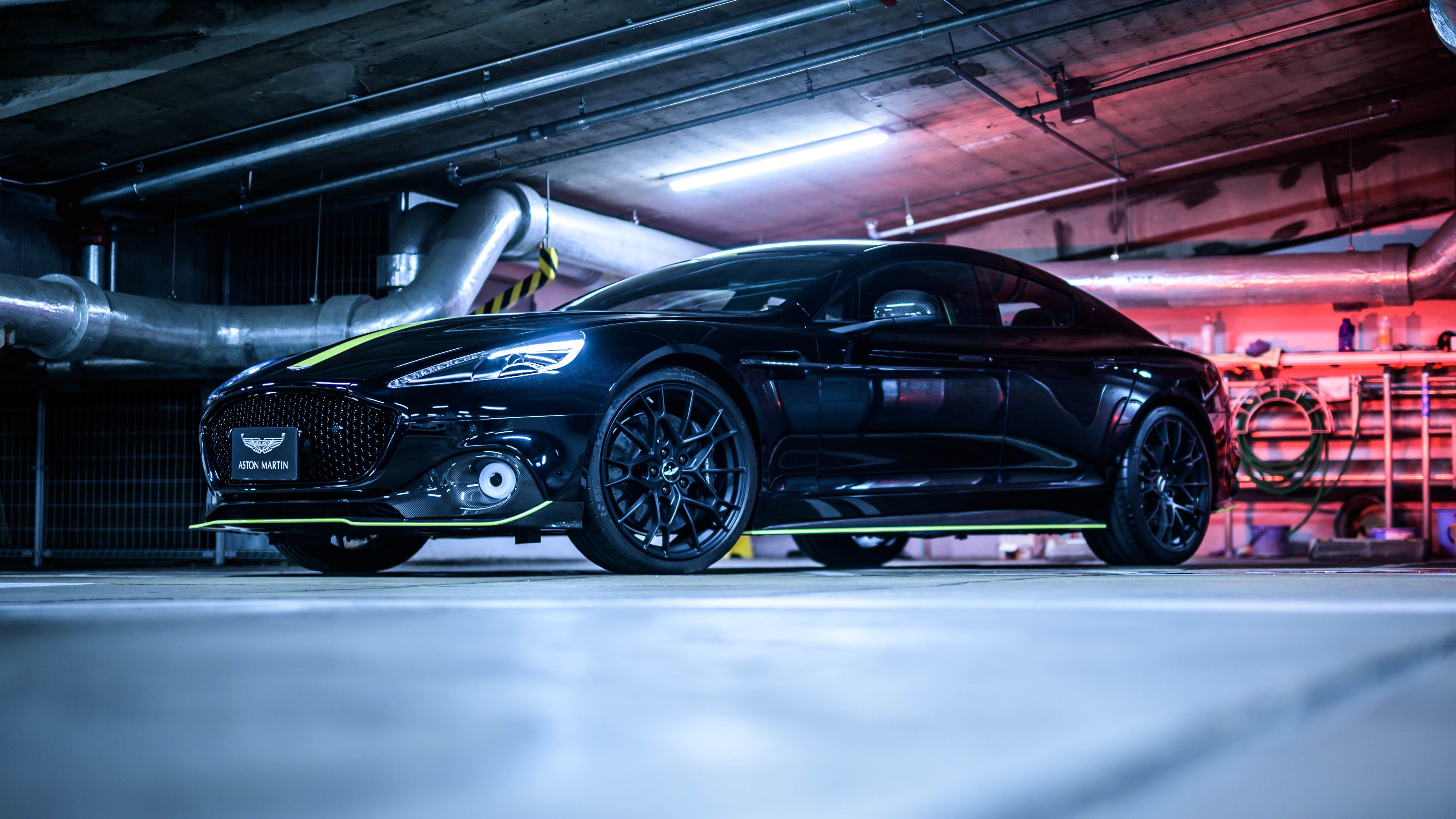 Description: A black sports car parked in a garage with a red light on the side of it and a pipe.
