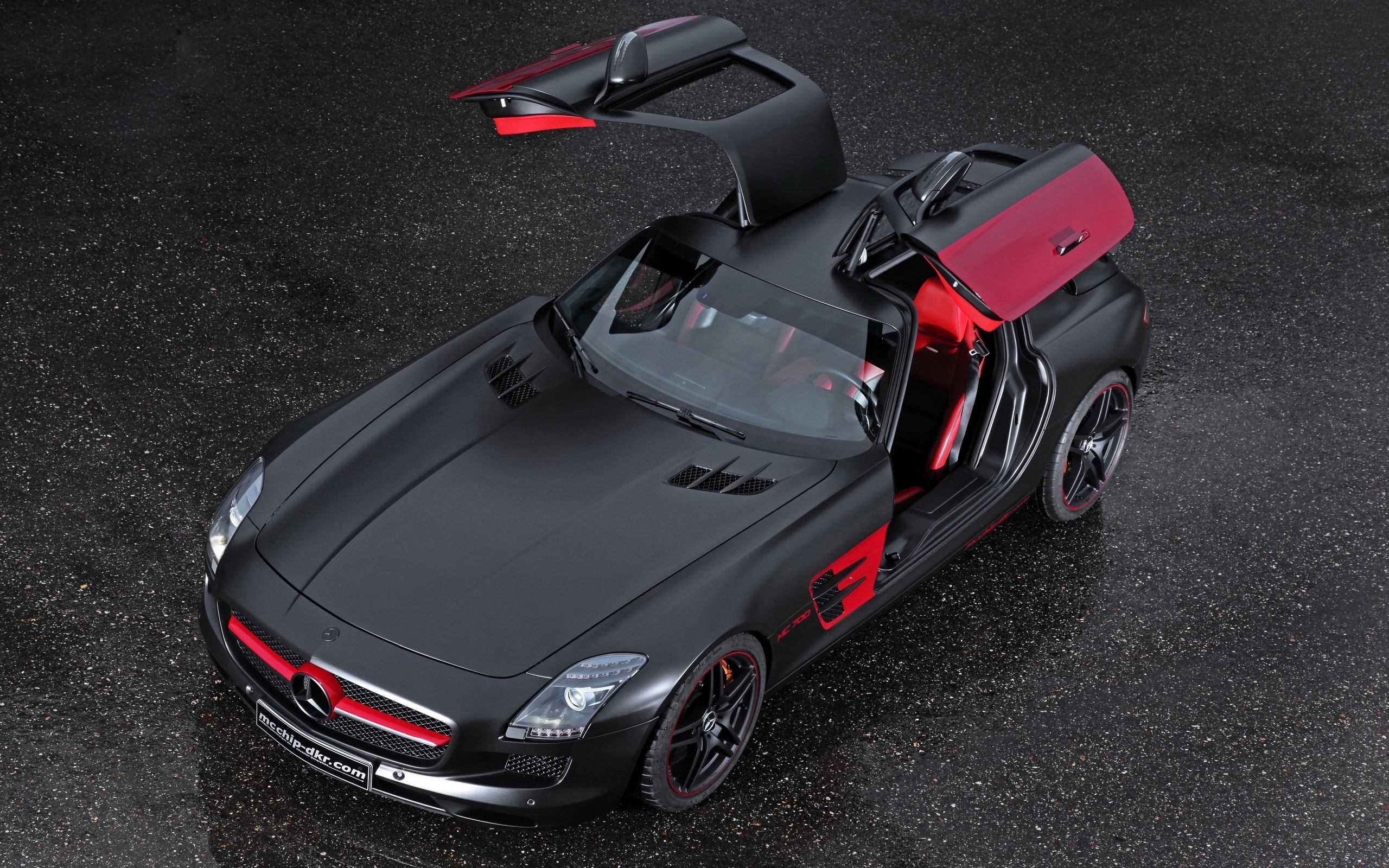 Description: A black sports car with a red stripe on the hood and door open on a black surface with a black background.