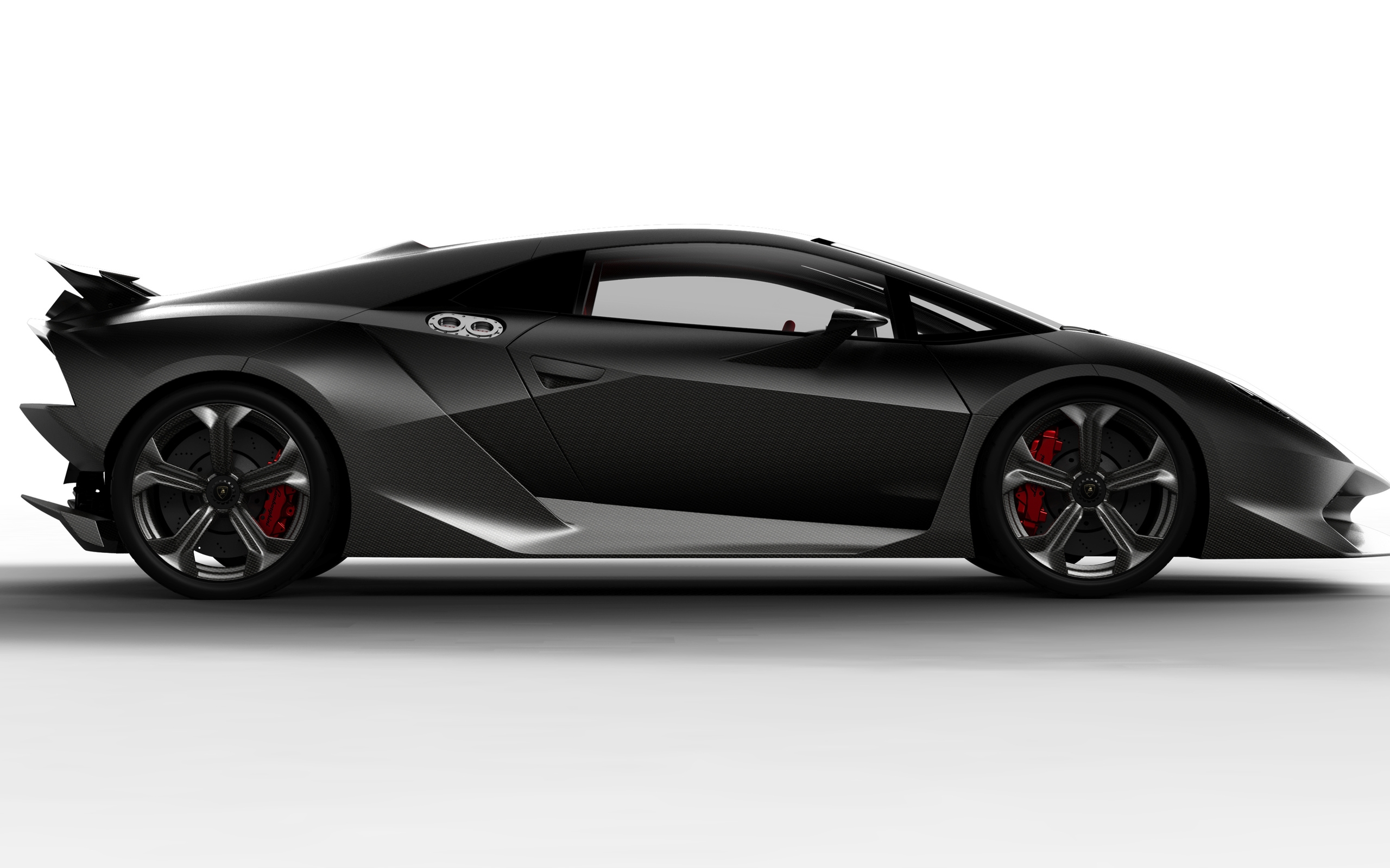 Description: A black sports car with red wheels on a white background with a shadow of the car in the background.