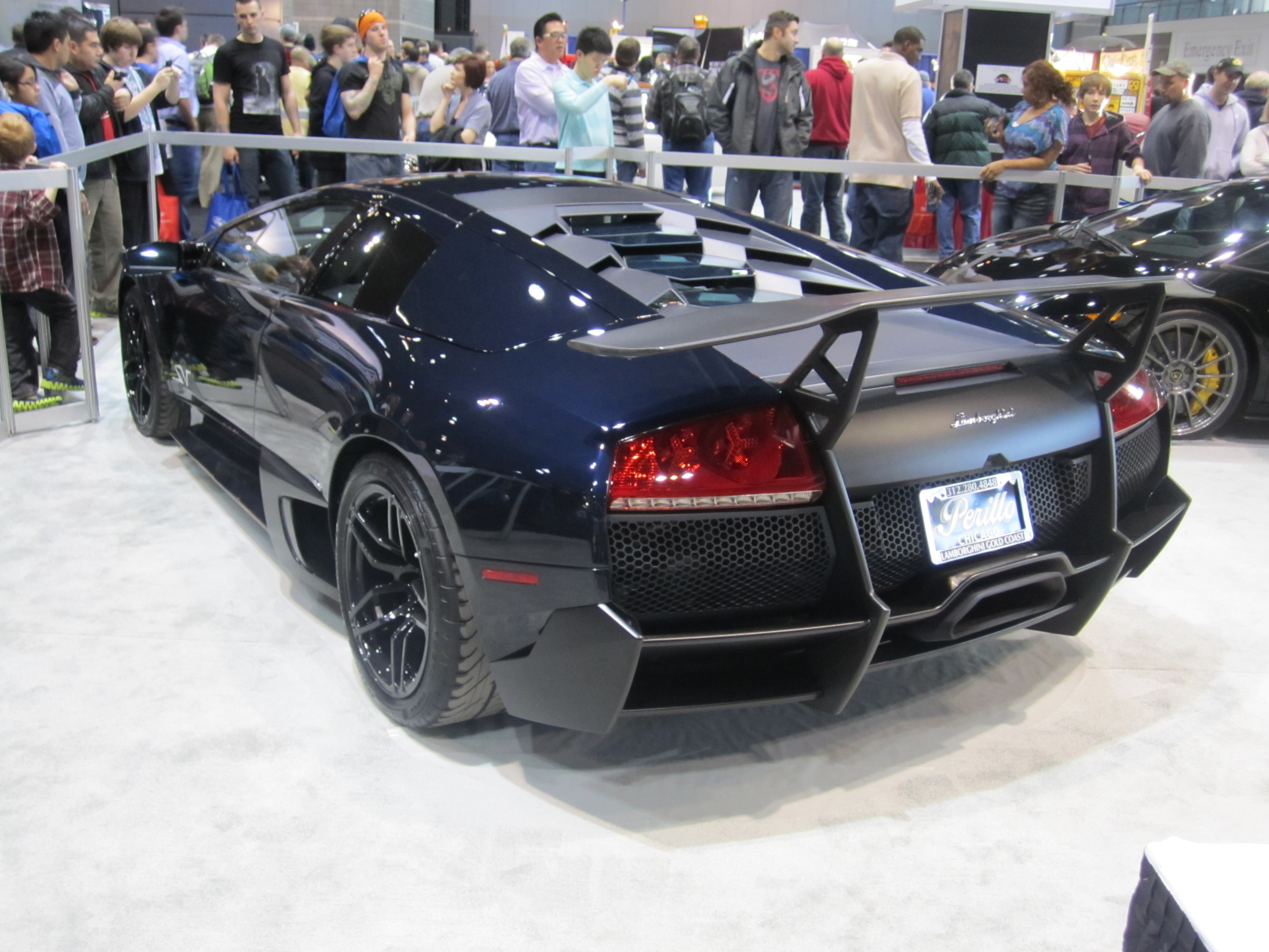 Description: A black sports car parked in a showroom with people looking at it and a crowd of people standing around.