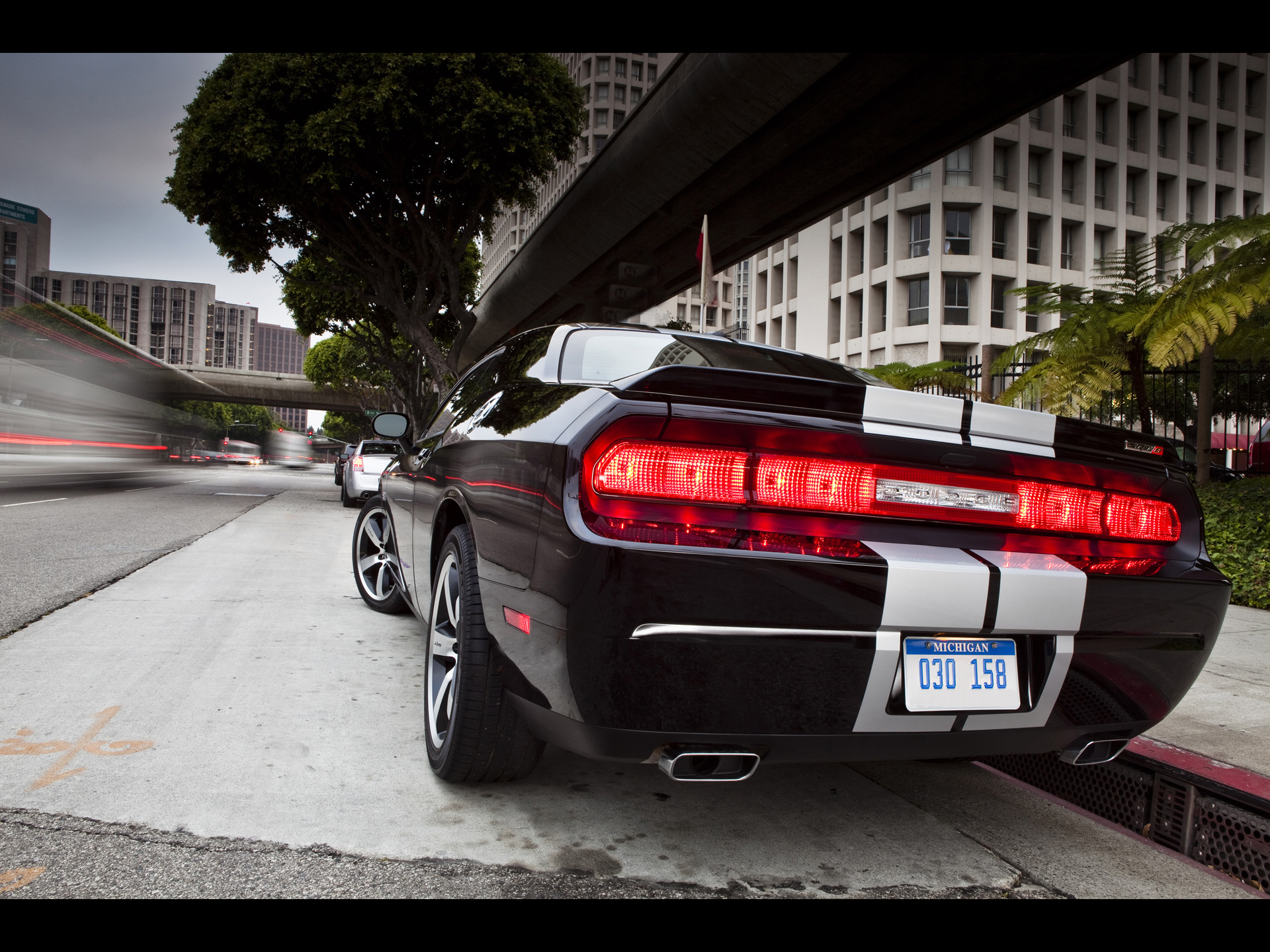 Description: A black sports car is parked on the side of the road near a curb with a car passing by.