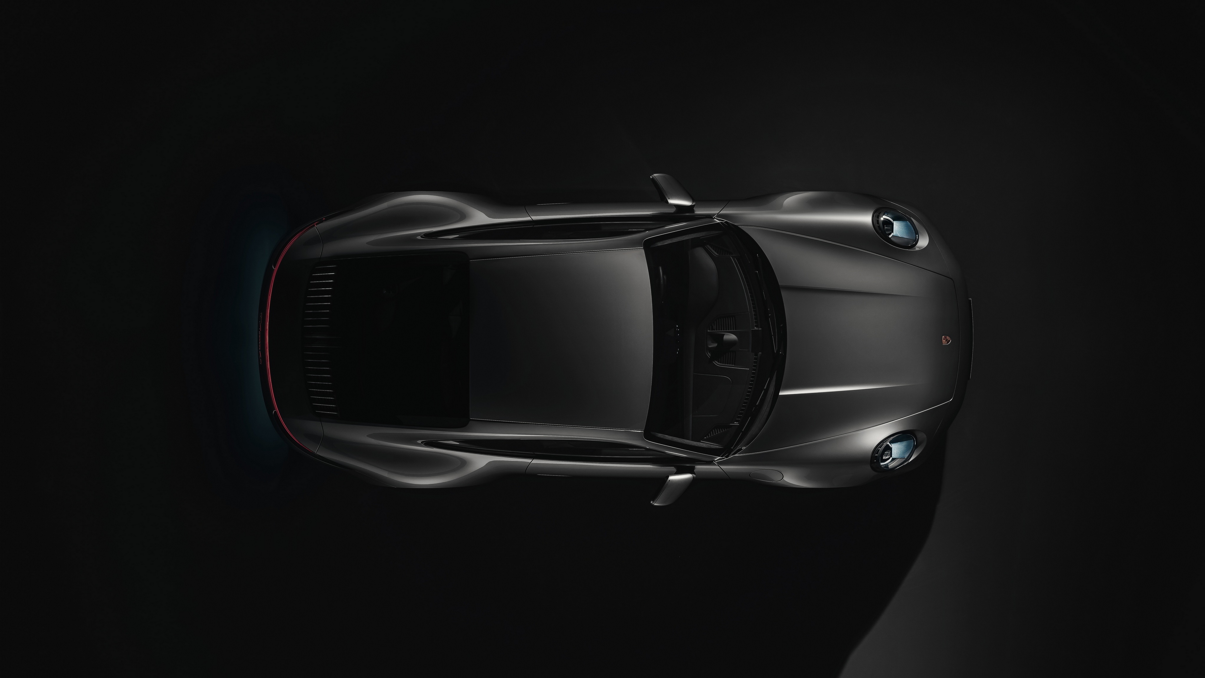 Description: A black sports car is shown from above in the dark room with a spotlight on the side of the car.