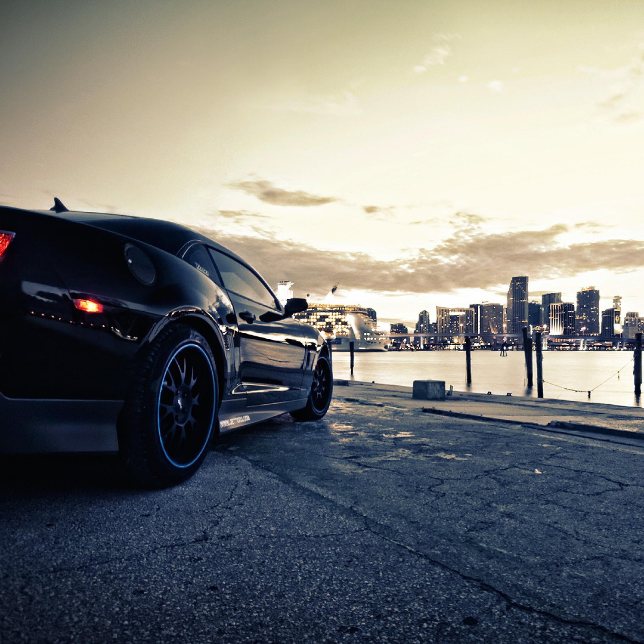 Description: A black sports car parked on the side of the road near a body of water with a city in the background.