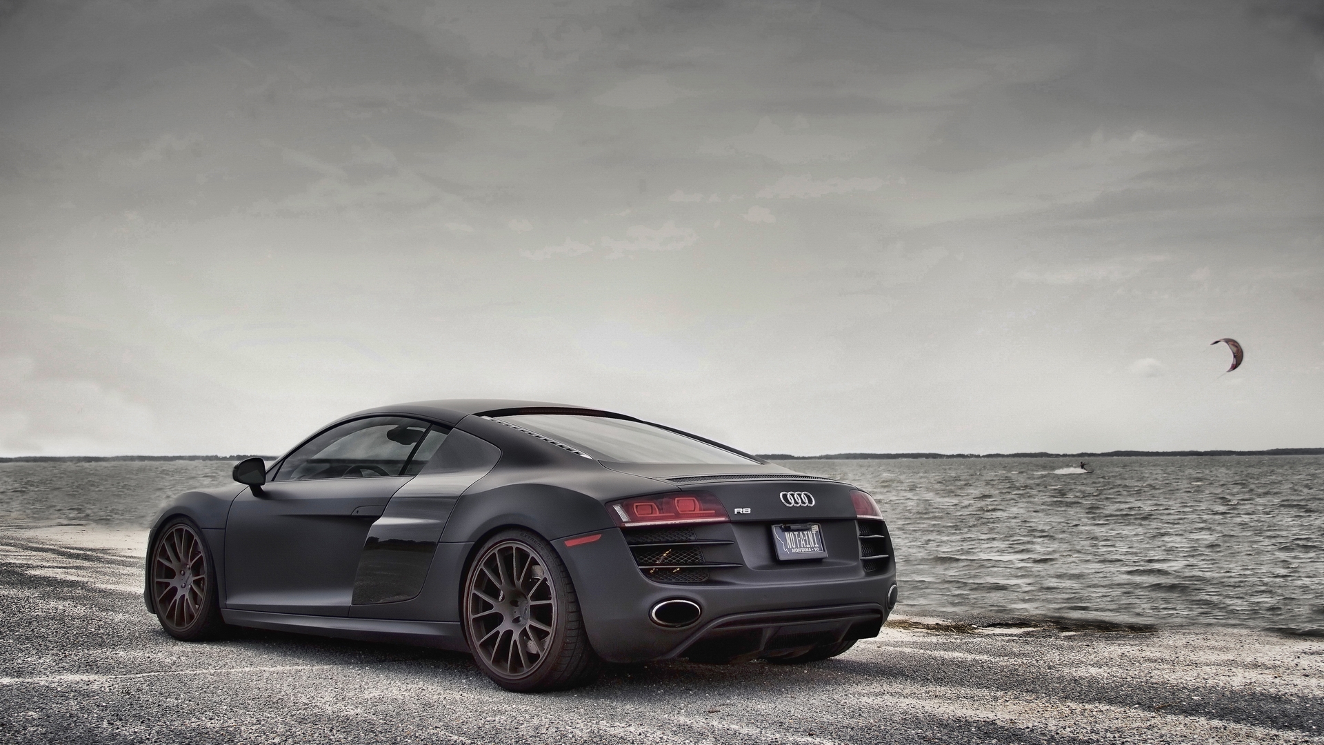 Description: A black sports car parked on the side of the road near the water and a kite flying in the sky.