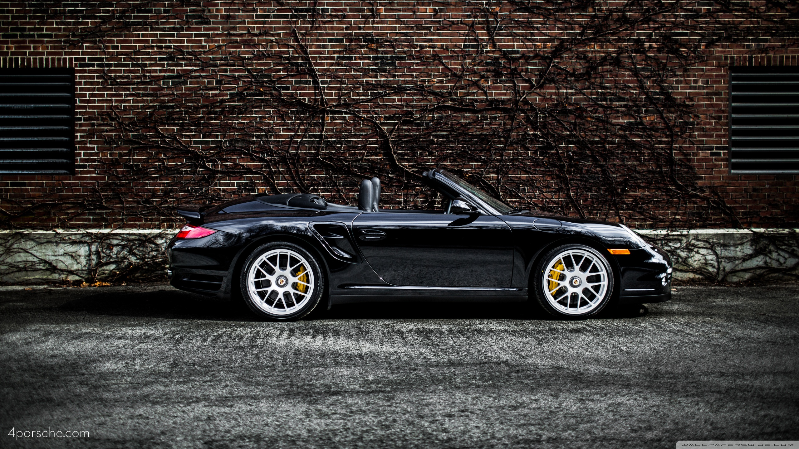 Description: A black sports car parked in front of a brick wall with a black roof and yellow rims and a black leather seat.