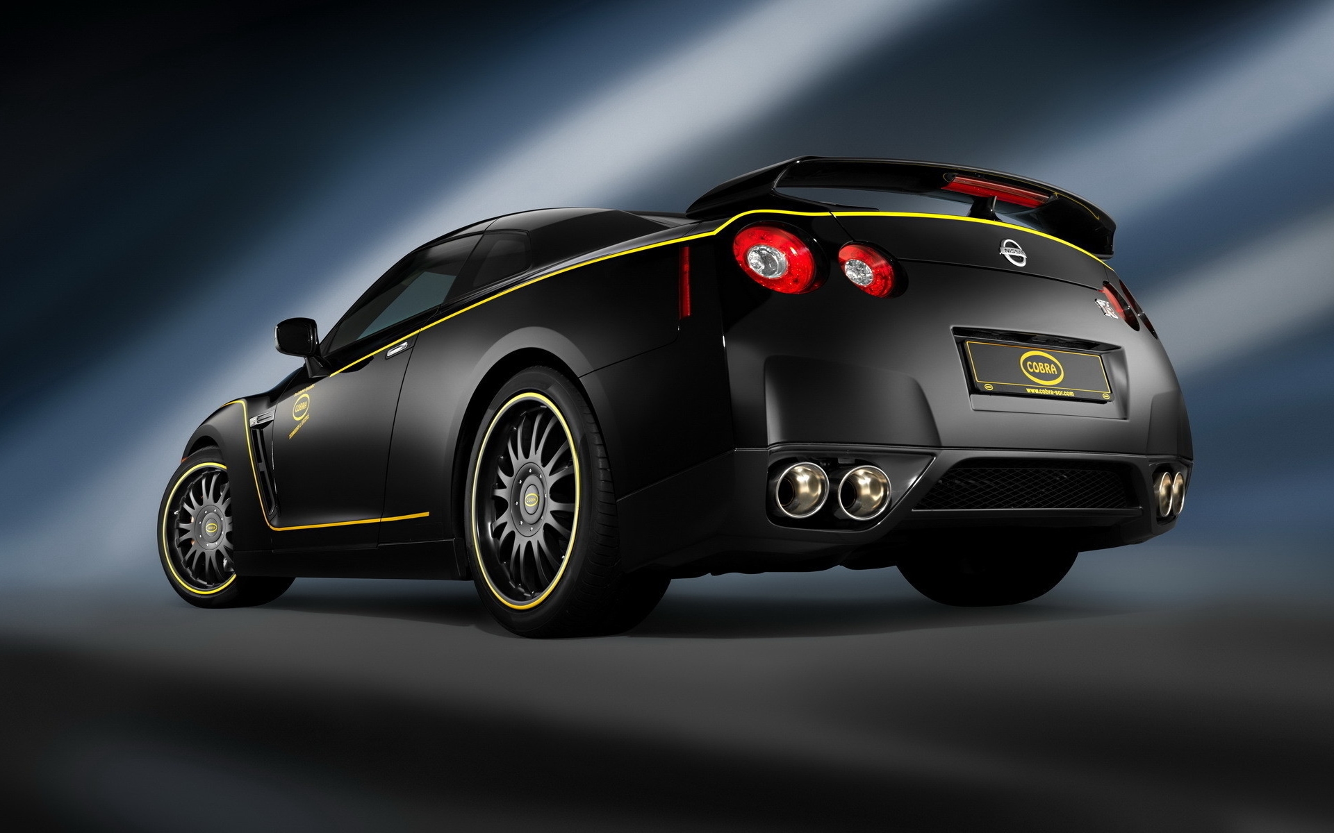 Description: A black sports car with yellow stripes on the back of it's trunk and tail lights on a dark background.
