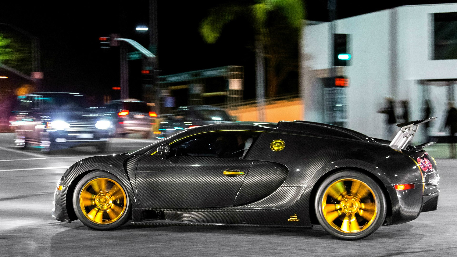 Description: A black sports car with yellow wheels on a city street at night with a car passing by on the road.