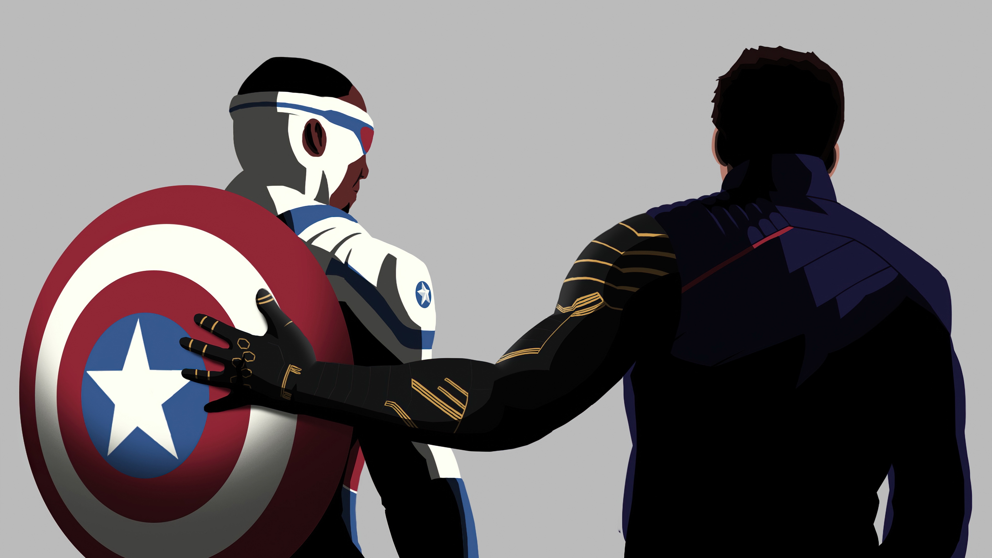 Description: A man in a black suit holding a shield next to a man in a black suit with a white star on it.