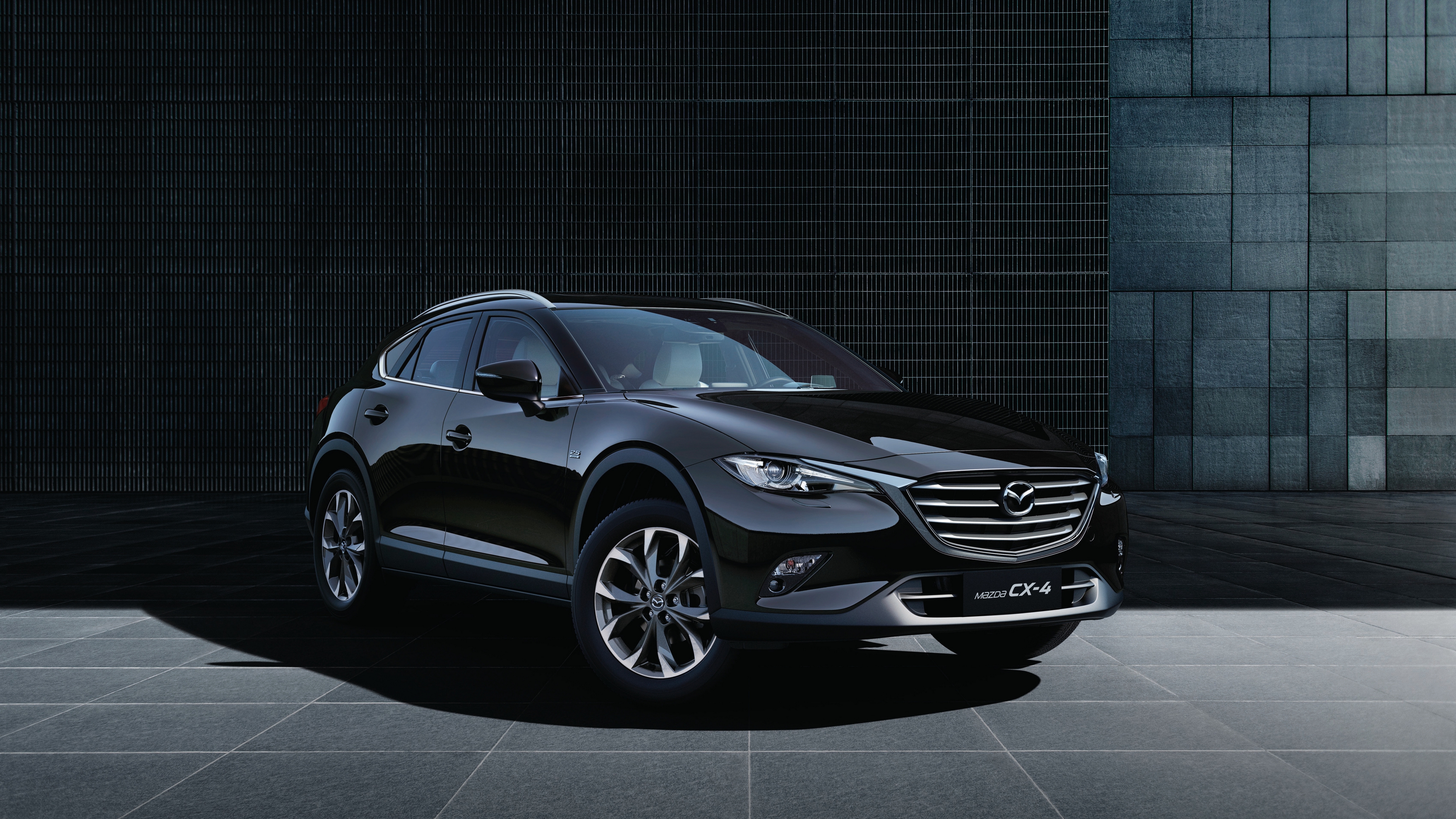 Description: A black suv parked in a dark room with a brick wall behind it and a black door in the background.