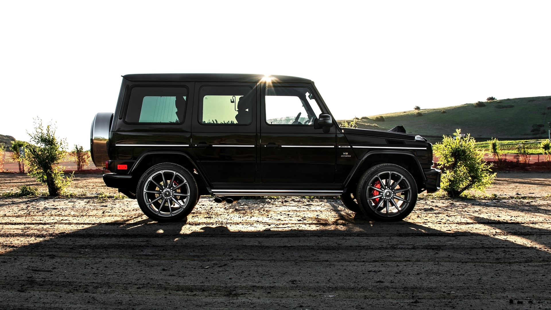 Description: A black suv parked in a dirt lot next to a field of grass and trees with a bright light shining on the top of the vehicle.