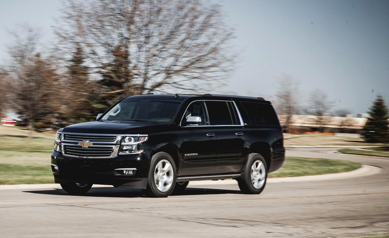 Description: A black suv driving down a road next to a tree and grass covered field with no leaves on it.