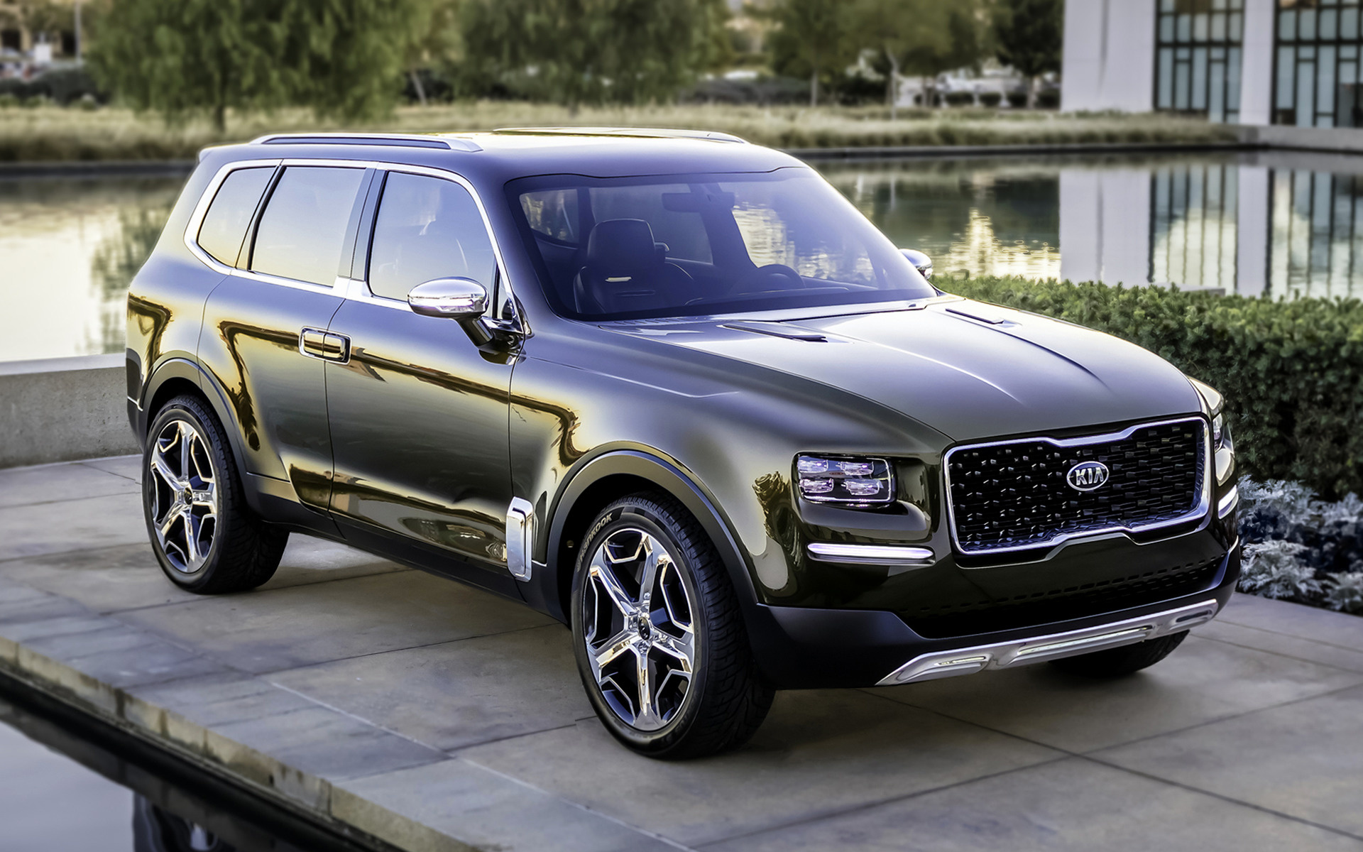Description: A black suv parked on a sidewalk next to a lake and a building with a clock on it's side.