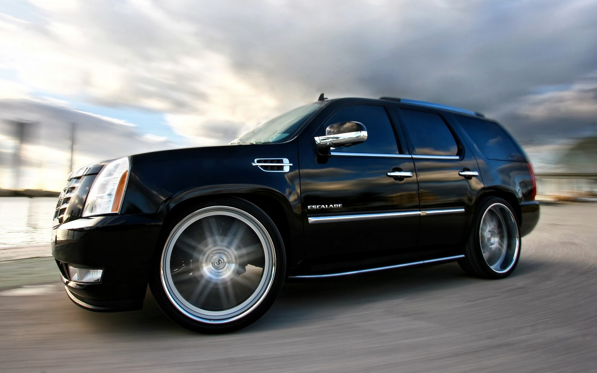 Description: A black suv driving down a street next to a body of water with clouds in the background and a blue sky.
