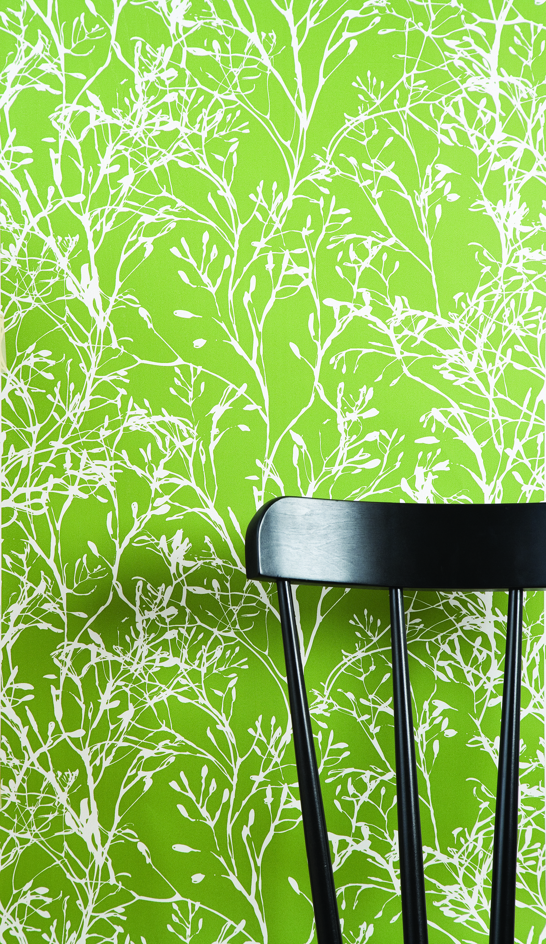 Description: A black table with a green wall behind it and a black chair in front of it with a black seat.